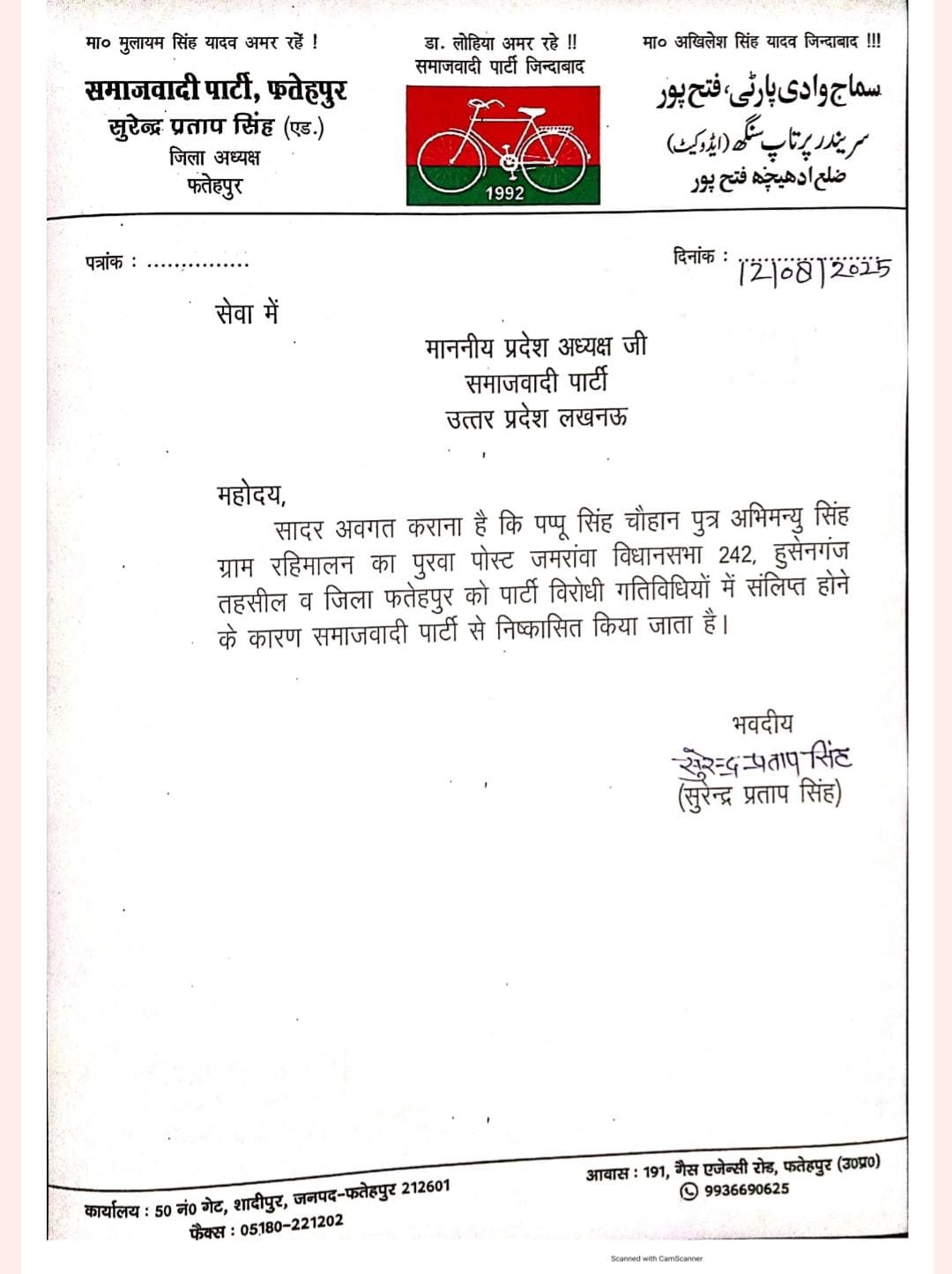 जनपद के शहर आबूनगर रेड़इया स्थित मंगी मकबरे को ठाकुर जी विराजमान मंदिर बताते हुए अराजकतत्वों द्वारा किए गए विवाद में शामिल सपा नेता पप्पू सिंह चौहान पुत्र अभिमन्यु सिंह निवासी ग्राम रहिमालन का पुरवा पोस्ट जमरावां थाना हुसैनगंज को सपा जिलाध्यक्ष सुरेन्द्र प्रताप सिंह ने पार्टी से निष्कासित कर दिया।