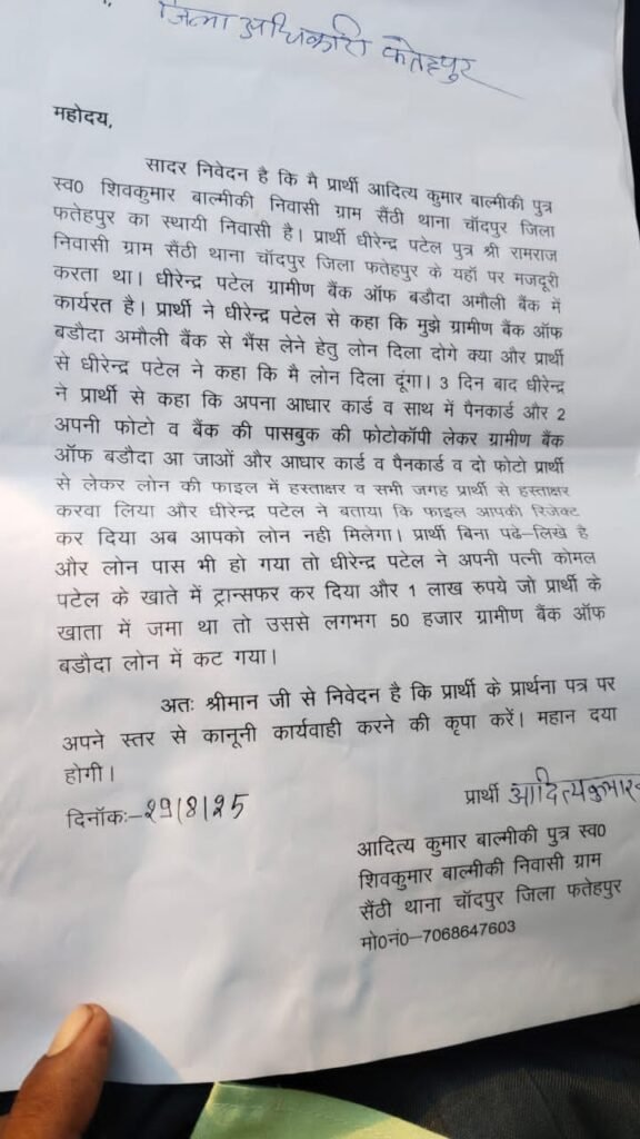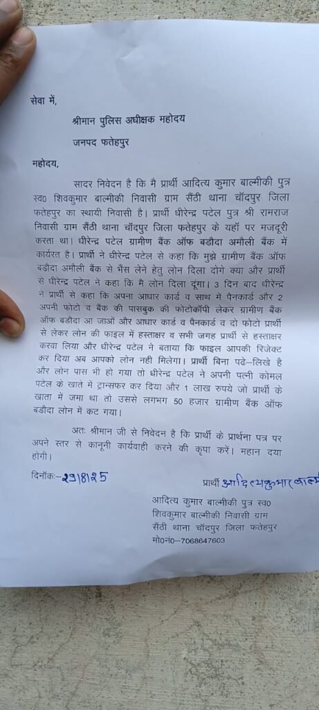 जनपद के चाँदपुर थाना क्षेत्र के अमौली कस्बे में स्थित ग्रामीण बैंक ऑफ बड़ौदा में तैनात धीरेन्द्र पटेल सविदा कर्मी ने एक किसान आदित्य कुमार बाल्मीकी पुत्र स्व शिव कुमार निवासी सैंठी से लोन दिलाने के नाम पर बड़ा फर्जीवाड़ा किया था।किसान के साथ हुए फर्जीवाड़ा से परेशान किसान ने नजदीकी अमौली चौकी में शिकायत दे जाँच कराकर दोषियों के खिलाफ कड़ी कार्यवाही करने की मांग की थी।स्थानीय पुलिस ने शिकायत के आधार पर बैंक जाकर जाँच की लेकिन पुलिस ने इस फर्जीवाड़े में अभी तक कोई तर्क सामने न आने से शिकायत कर्ता पुलिस की कार्यशैली से असंतुष्ट न होने के कारण शुक्रवार को फतेहपुर के डीएम एसपी दफ्तर पहुँच कर लिखित शिकायत करते हुए पूरे प्रकरण की निष्पक्ष तरीके से जाँच करा कर कठोर कार्यवाही करने की मांग की है।शिकायत कर्ता ने बताया है की लोन के नाम पर धीरेन्द्र पटेल ने सारे कागजात लेकर कागजो में साइन करा कर लोन न होने की बात बताई थी इसके कुछ महीनो बाद गुप्त तरीके से बैंक कर्मचारियों से मिलकर संविदा कर्मी ने अपने पुलिस कर्मी पत्नी कोमल के खाते में एक लाख रूपये डलवाए थे।किसान को डीएम एसपी दफ्तर से अश्वासन मिला है की पूरे मामले की जाँच कराकर दोषियों के खिलाफ कठोर कार्यवाही की जायेगी।